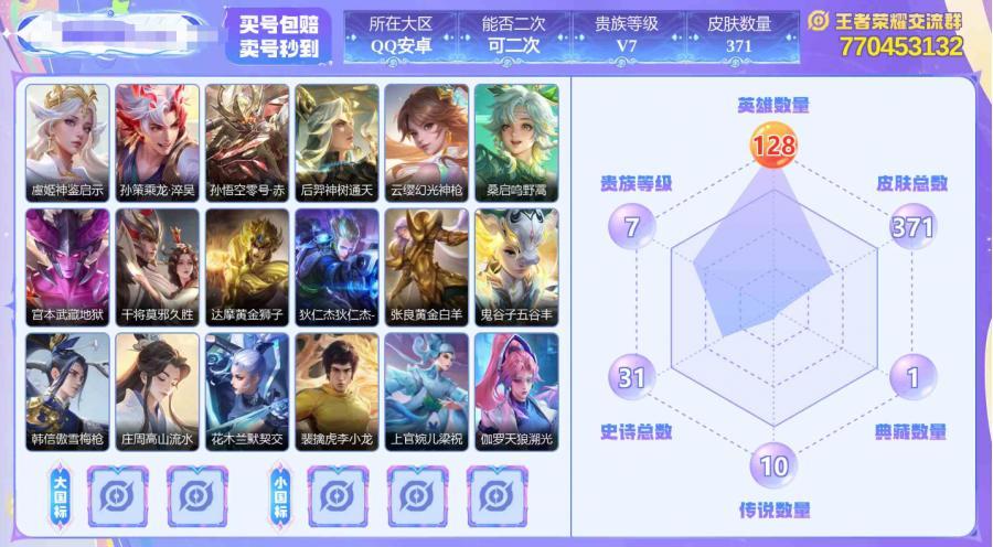 【V7 最强王者 英雄数量:128 皮肤数量:371 荣耀典藏:1个 传说皮肤:10个 稀有限定:19个 皮肤价值:263408】