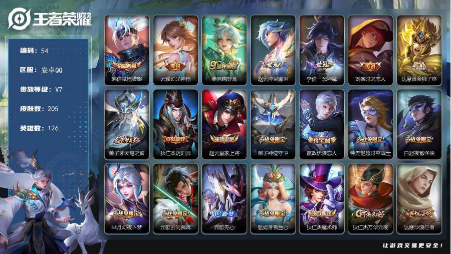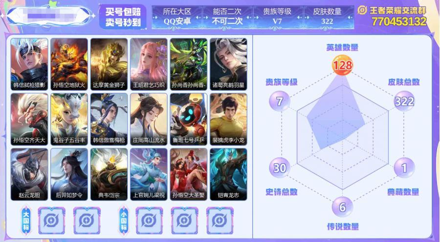 【V7 至尊星耀 英雄数量:128 皮肤数量:322 荣耀典藏:1个 传说皮肤:6个 稀有限定:19个 皮肤价值:226812】