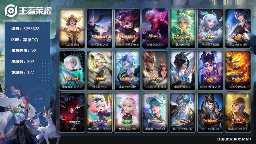 【V8 非凡王者 英雄数量:127 皮肤数量:385 荣耀典藏:2个 无双至尊:1个 珍品传说:1个 星传说:2个 传说皮肤:14个 稀有限定:20个 皮肤价值:287520】W10124,,,可立即换绑无需挂单养号,铭文满级,,,典藏2,,,传说14,,,星传说2,,,按键7,,,夺宝219,,苹果Q-V8-Z强王者段位-127英雄-385皮肤-2典藏