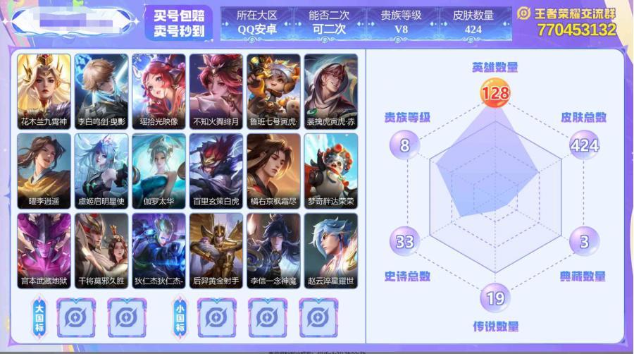 【V8 至尊星耀 英雄数量:128 皮肤数量:424 荣耀典藏:3个 传说皮肤:19个 稀有限定:20个 皮肤价值:340284】【王者荣耀】【LYWZ33397】珍品无双0典藏3无双0珍品传说0传说19史诗127英雄128皮肤424贵族8级荣耀典藏:九霄神辉|鸣剑·曳影区服类型: 王者荣耀 |