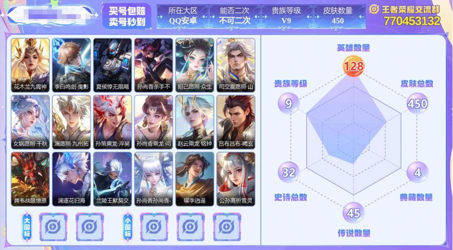 【至圣王者 英雄数量:128 皮肤数量:425 荣耀典藏:2个 珍品传说:1个 星传说:4个 传说皮肤:25个 稀有限定:26个 皮肤价值:329750】【W5903】安卓QQ-有二次-贵8-128英雄-425皮肤-2典藏-1珍品传说-25传说-4星元-156限定-13按键-灵宝-21印记-满铭文-7区服类型: 王者荣耀 |