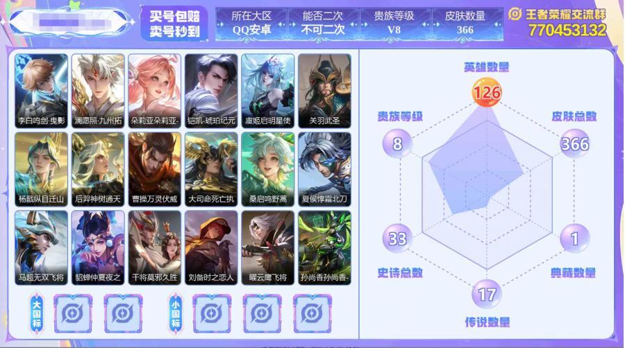【V8 至尊星耀 英雄数量:128 皮肤数量:392 荣耀典藏:3个 无双至尊:1个 星传说:3个 传说皮肤:18个 稀有限定:17个 皮肤价值:304850】-V8-392皮肤3典藏1无双18传说3星元132史诗122限定-1146紫星币【全皮英雄】刘邦全皮猪八戒全皮【典藏】武则天星域神启九霄神辉【无区服类型: 王者荣耀 |