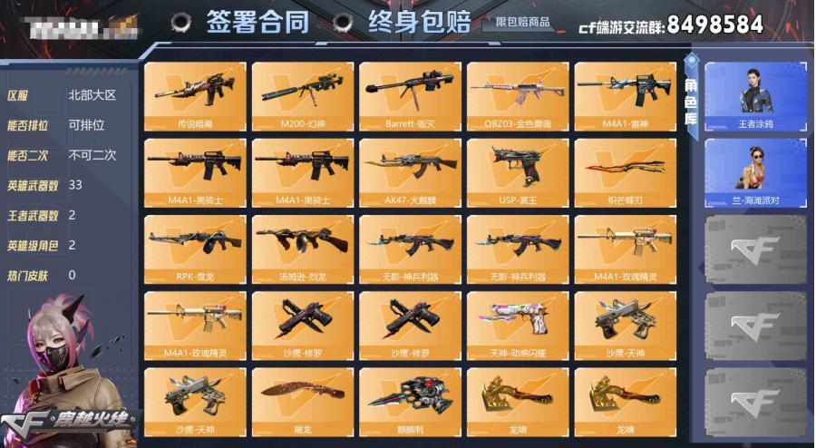 【不可二次 英雄武器数量:33 英雄角色数量:2 王者武器数量:2 王者涂鸦 兰-海滩派对 AK47-火麒麟音效卡,M4A1-黑骑士音效卡 屠龙-春桃,无影-神兵利器 传说暗裔 稀有武器:8个 】