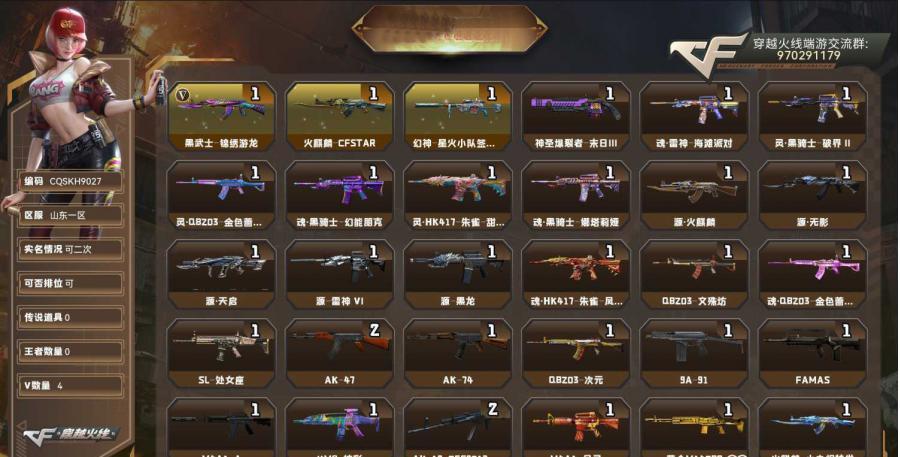 【CQSKH9027】 4V,可二次实名,Lv.60 中校1,0传说/0王者/0炫金/3英雄/CF点6598/【英雄武器4】黑武士-锦绣游龙/手雷-热带奇洋/闪光弹-云龙/高爆手雷-竞技荣光【热门皮肤武器2】火麒麟-CFSTAR/幻神-星火小队签名臻藏版【挑战武器武器1区服类型: 穿越火线 |