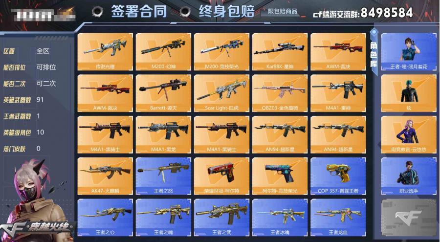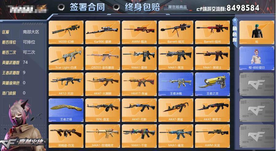 【V1 王者武器V数量:2 英雄武器V数量:68 特殊武器:1个 98K-星神 角色:3个 】【V1王者武器V数量:2英雄武器V数量:68特殊武器:1个98K-星神角色:3个】区服类型: 穿越火线 |