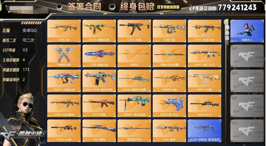 【V3 王者武器V数量:4 英雄武器V数量:173 王者武器:M12S-雷霆王者,王者之霆,王者之影 特殊武器:21个 M200-幻神,CZS2-仲康,激昂霸王枪,SKS-曳鼎,甩棍-卧龙觉醒,啖睛矢,双持沙鹰-元让,巴雷特-朱雀,DDM4-PDW-星际宇航觉醒,匕首-浩瀚征途,QBZ97-浩瀚征途,81式-光明之神,AWM-妙才,M4A1-神工天巧,MK47-云舞,98K-星神,M16-恶魔,AN94-赳赳秦师,QBB95-再战涿鹿,气勇胆烈戟,AWM-指南针觉醒 角色:2个 万化:8个 消灭音效-诸神黄昏,狙击枪线-诸神黄昏,狙击枪线-HeartShot,MK47-鼓龙-嘴炮,消灭音效-斩杀,AK47-无影-电音,AWM-裁决-流光之线,98K-星神-电音】